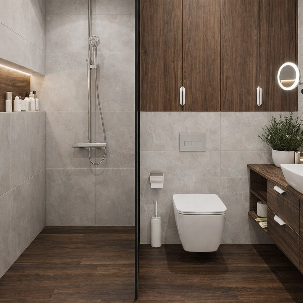 - Установка сантехники (унитаз с инсталляцией, тропический душ, раковина, полотенцесушитель, вентилятор/вытяжка)